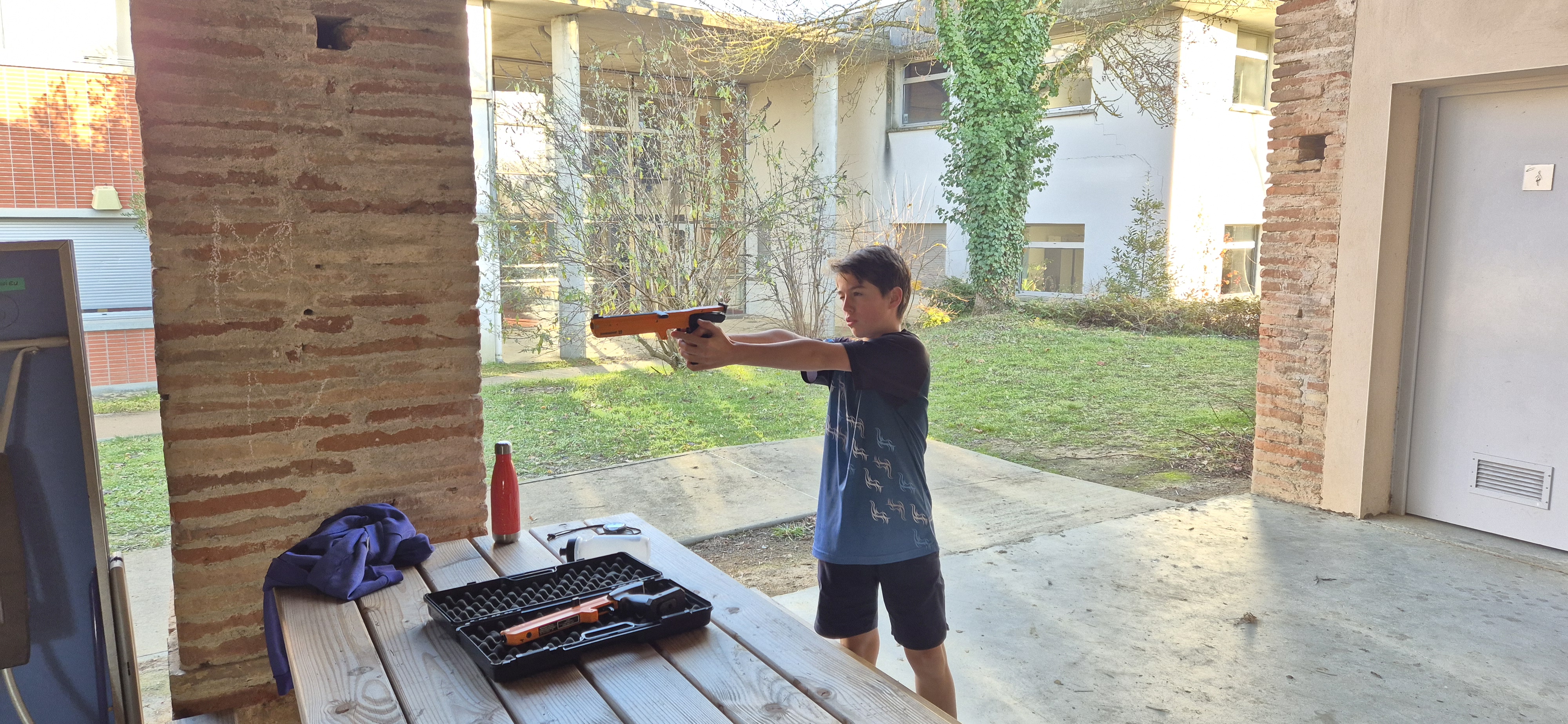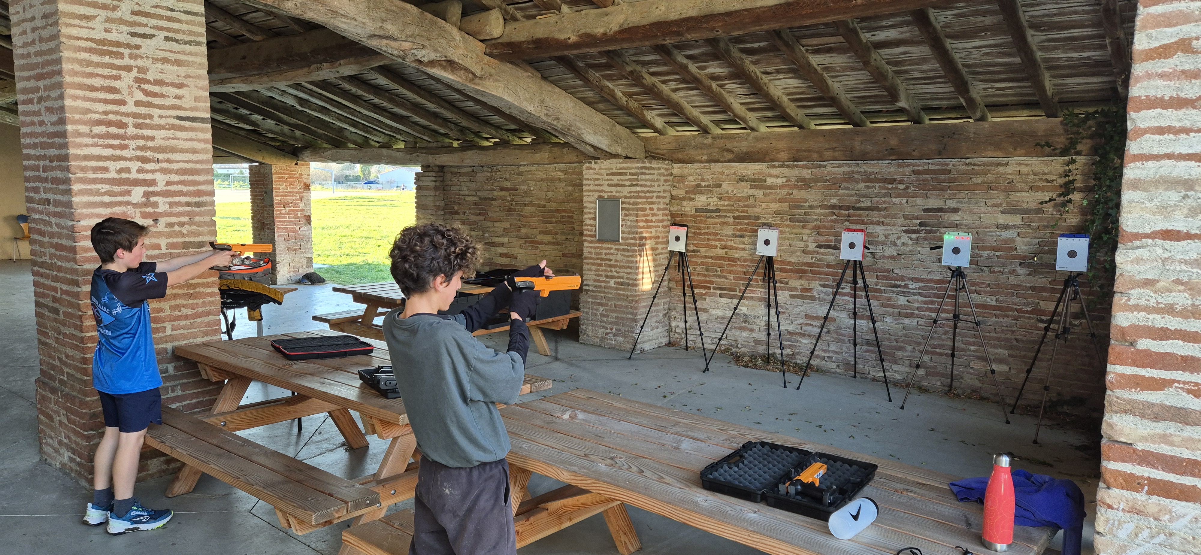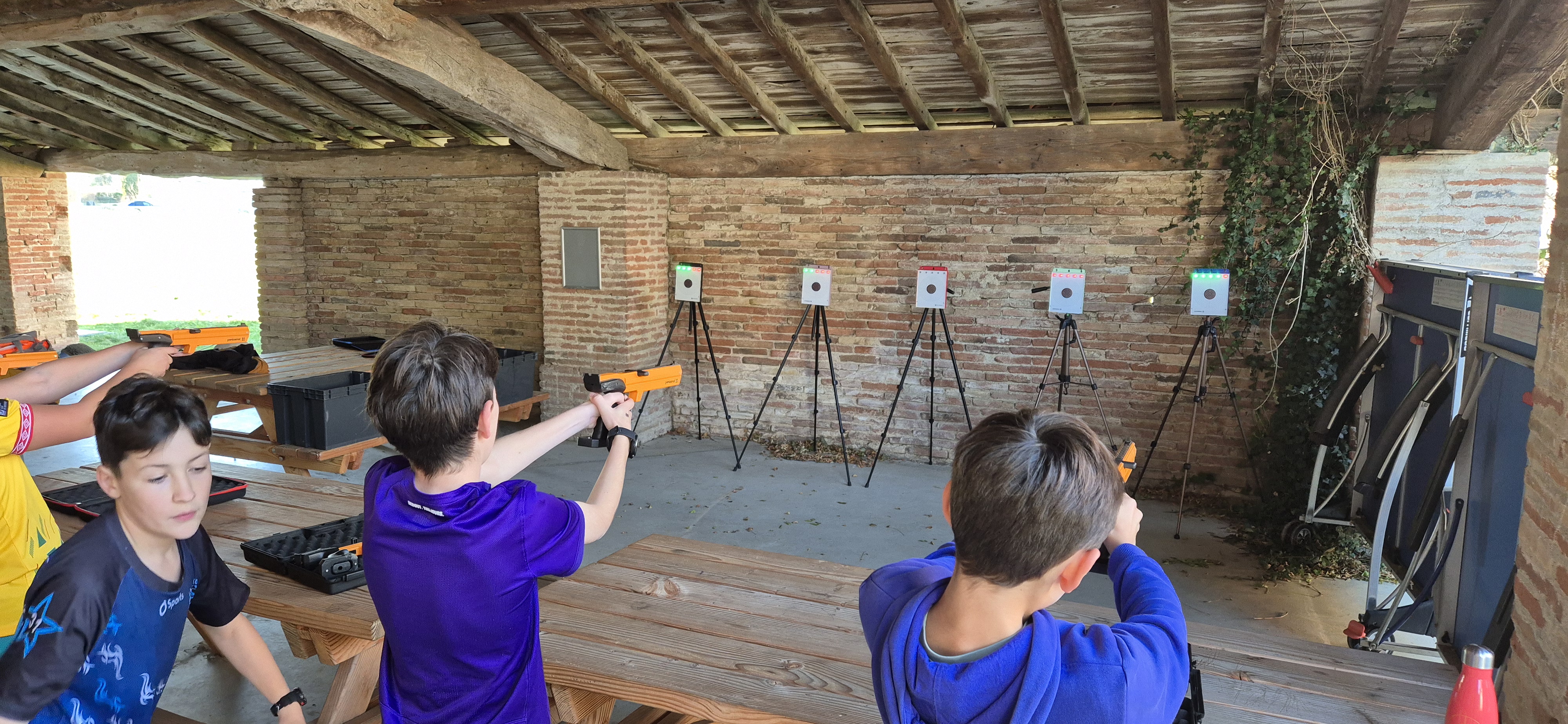Le Laser Run est une activité multisport qui associe course à pied et tir au pistolet laser. Les participants doivent enchaîner des phases de course avec des séquences de tir, durant lesquelles ils doivent toucher cinq cibles à une distance réglementaire, avec un nombre de tirs illimité mais dans un temps imparti de 50 secondes. Une fois les cibles atteintes, les élèves repartent immédiatement en course, mettant à l’épreuve leur capacité à gérer l’effort et la concentration.
